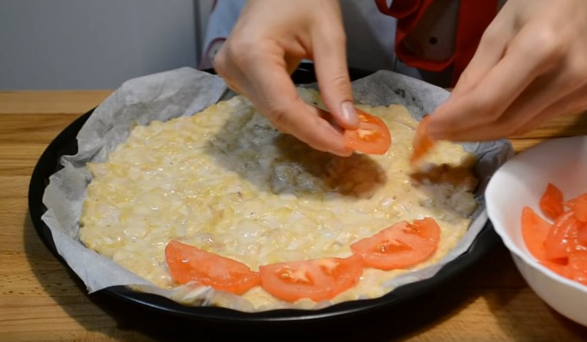 Порізати помідори кружечками і викласти зверху на курку. Знову додати трохи солі та перцю.![]()