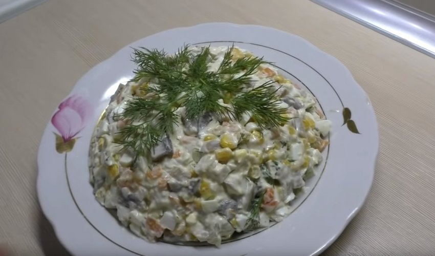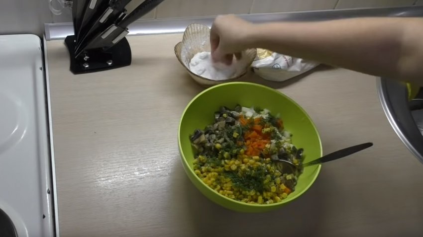 Нашаткувати печериці на довільні невеликі шматочки. з'єднати все в окремій тарі. висипати кукурудзу, кріп. додати майонез і сіль. перемішати.![]()