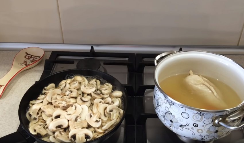 Нашаткувати печериці на середні шматочки і відправити смажитися на пательню без олії. Відварити куряче м'ясо в підсоленій воді зі шматочками моркви і цибулі.![]()