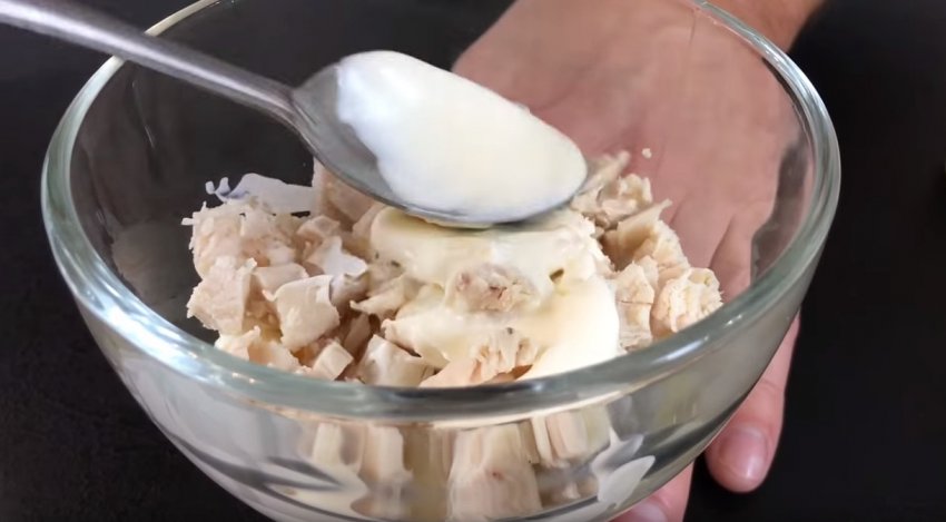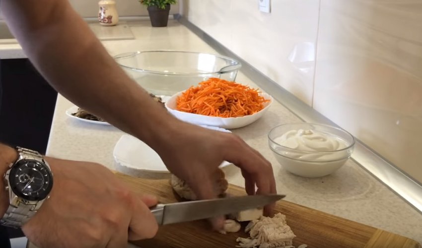 Відварити куряче м'ясо, яйця і моркву.Дрібно порізати цибулю півкільцями. Щоб вона не гірчила, посипати сіллю і віджимати, поки зайвий сік не вийде.![]()