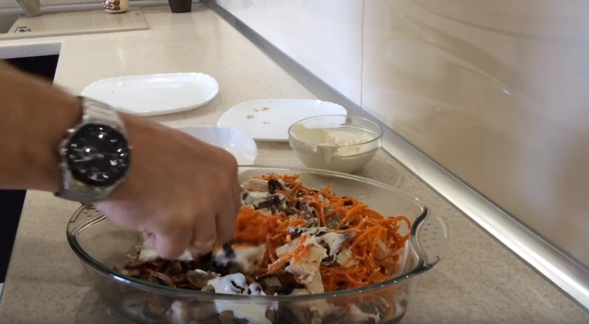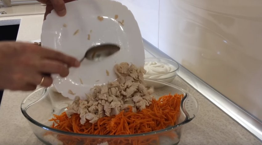 Корейську моркву висипати в окрему тарілку, туди ж відправити гриби та філе.![]()