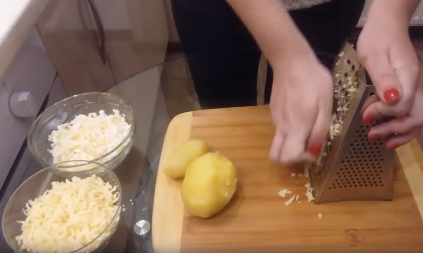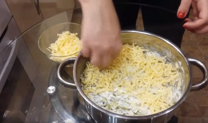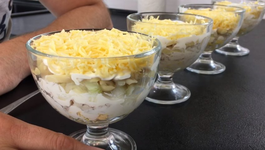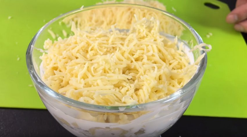 Посипати все натертим на тертці сиром. Цей шар не заправляти майонезом.![]()