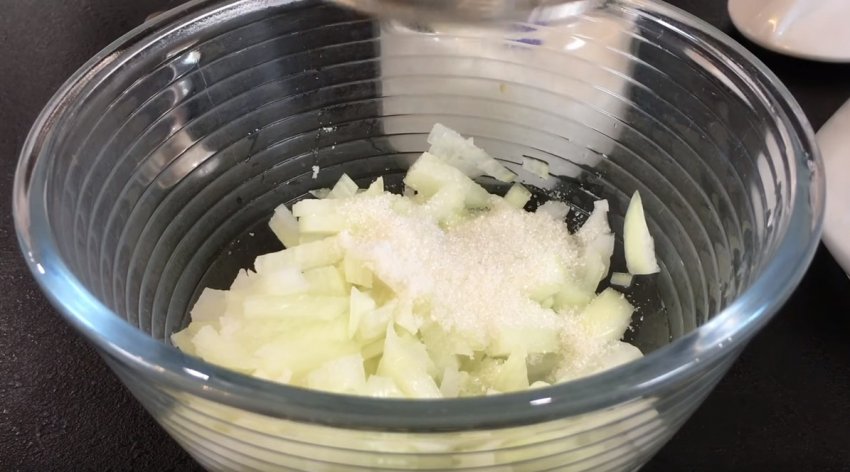 Нарізати кубиками цибулю, перекласти в миску, додати сіль, цукор, оцет і залити гарячою водою, перемішати і залишити остигати.![]()