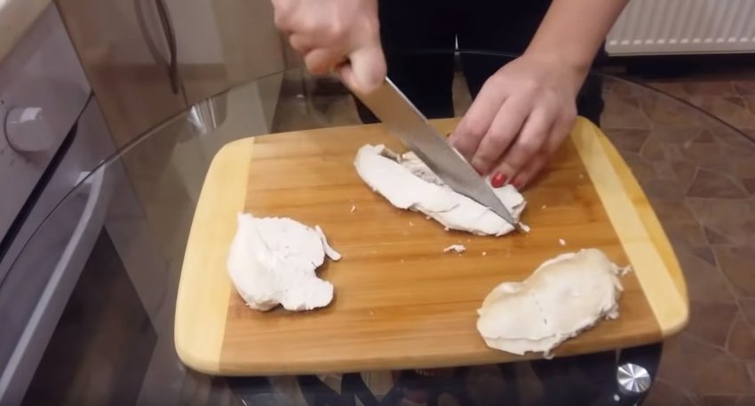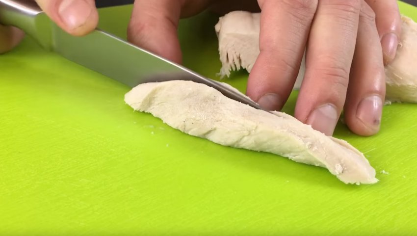 Як тільки зайва вода з грибів випарується, необхідно додати олію і залишити ще на 5-10 хвилин. Варене філе нарізати соломкою.![]()