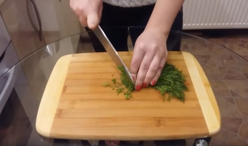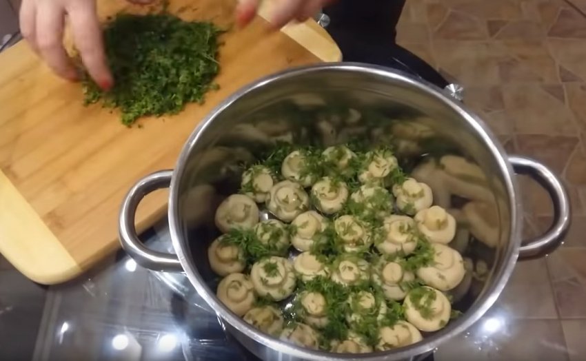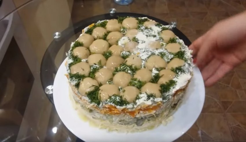Взяти тару для салату, змастити олією і викладати страву шарами, змащуючи кожен майонезом. Викласти печериці так, щоб капелюшки були внизу. Посипати кропом.![]()