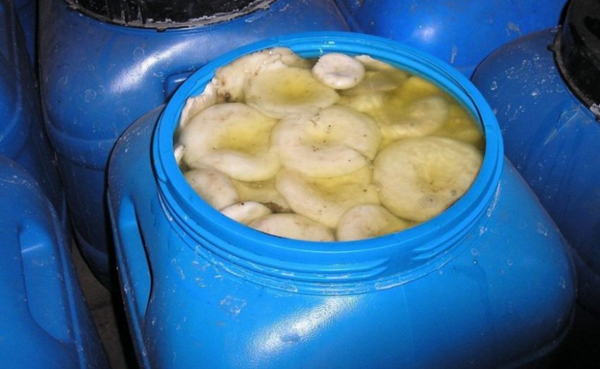 - Бочку з грибами встановити в прохолодне, темне приміщення, в якому температура повітря зберігається в межах +1...+6°С. Через 25-30 днів можна пробувати продукцію на смак і пригощати нею домашніх і друзів.