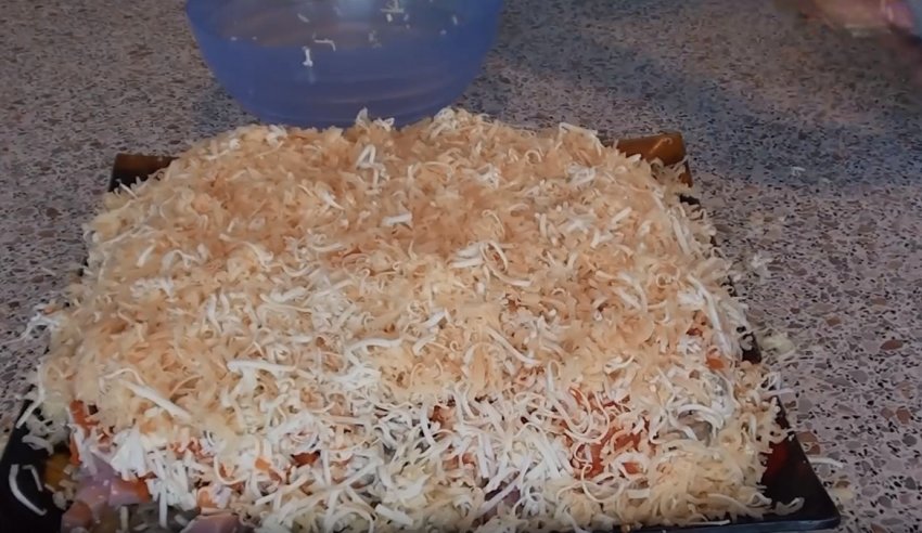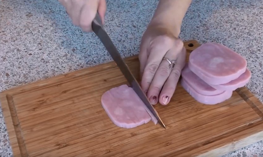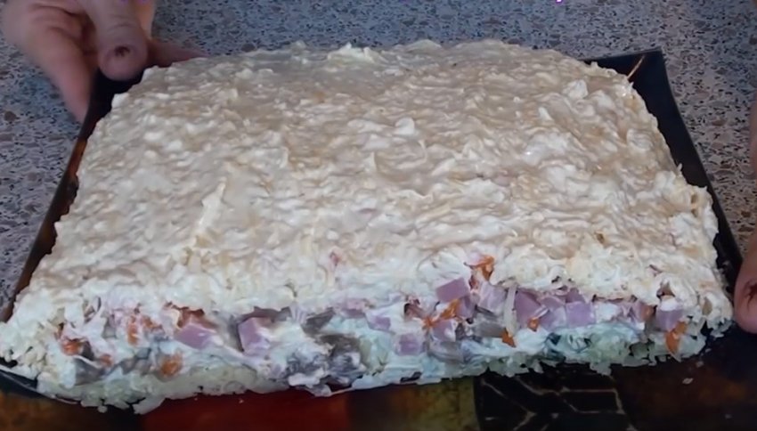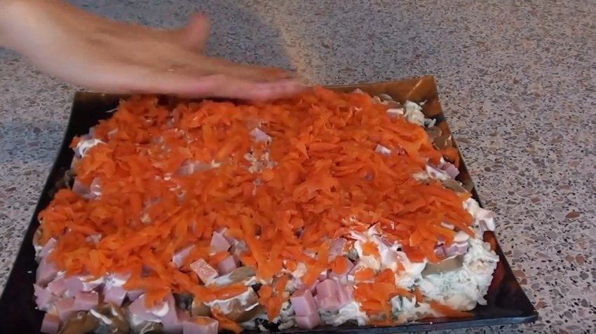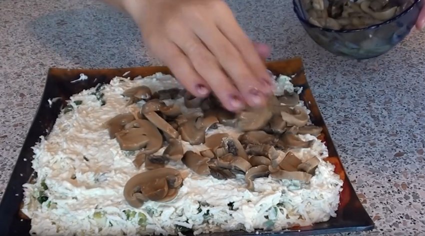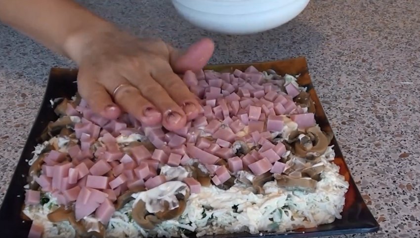 Рецепт салату з печерицями, шинкою, цибулею, яйцями та сиром
