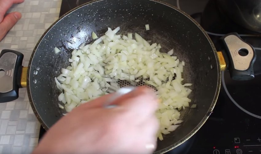 на вогонь глибоку сковорідку, налити в неї трохи олії та дати добре нагрітися, викласти в сковорідку цибулю й обсмажити до напівпрозорого стану.![]()