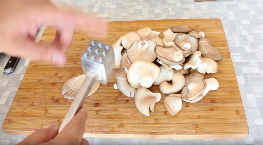 Капелюшки глив відокремити від ніжок. Буде правильніше, якщо гриби будуть з великими верхівками. кожен капелюшок злегка відбити молотком. Робити потрібно не сильно, м'якими ударами плоскою стороною молотка.![]()