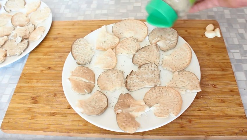 Викласти готові капелюшки на плоский посуд, присипати сіллю і спеціями. У такому рецепті краще використовувати адигейську сіль. Кожен капелюшок кладеться догори ногами, щоб ніжніша його частина просочилася спеціями. Залишити гриби на 5 хвилин для маринування.![]()