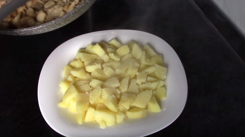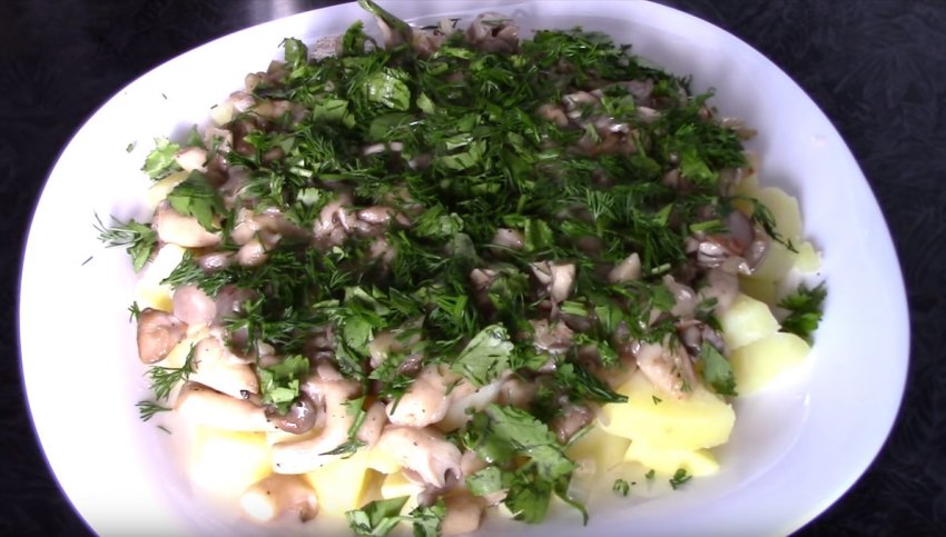 Другий інгредієнт - відварену картоплю відкинути на друшляк і дати стекти воді.Викласти картоплю рівним шаром на блюдо, зверху розкласти гриби. Наприкінці можна прикрасити дрібно нарізаною зеленню. Виходить смачна страва, яку можна подавати на святковий стіл.![]()