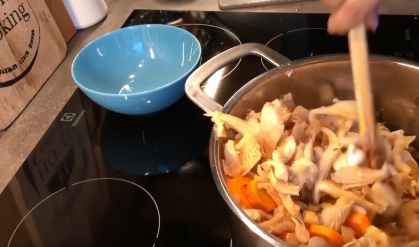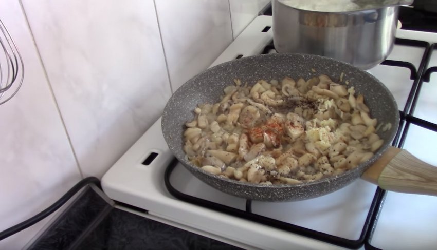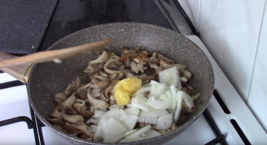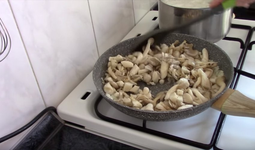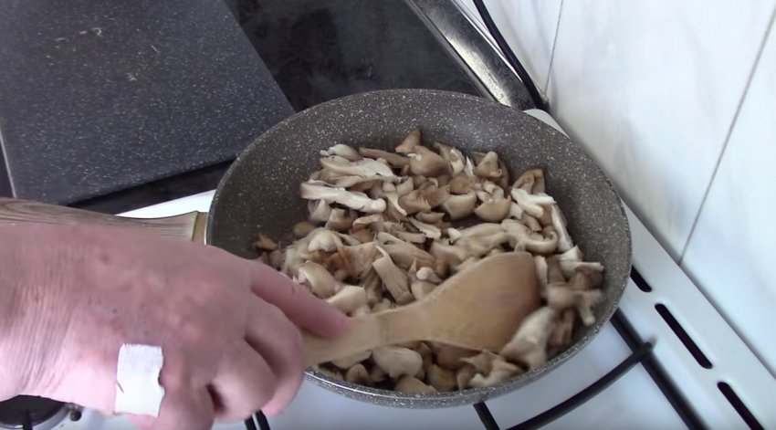 Коли цибуля злегка обсмажиться (стане золотистою), до неї додають гливи. Смажать на сильному вогні, поки не випарується волога.![]()