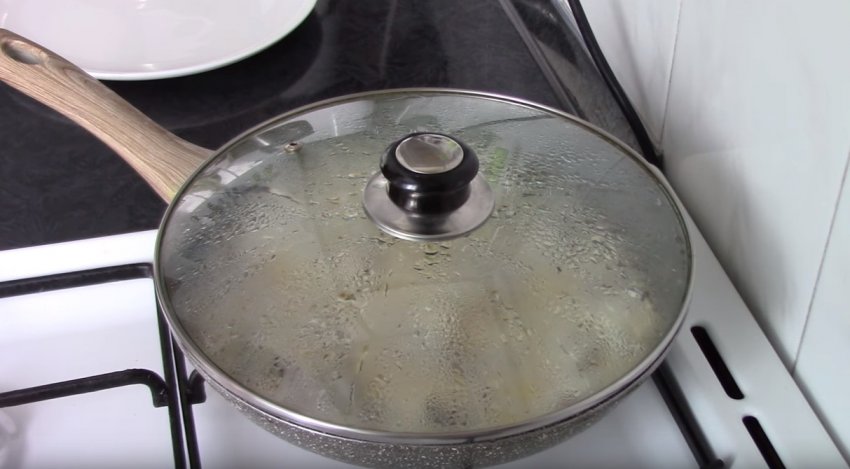 Видавити в сковорідку часник, додати мелений перець (скільки додавати, залежить від вподобань) і перець чилі. Посолити, накрити кришкою, вимкнути вогонь і залишити на 5 хвилин.![]()
