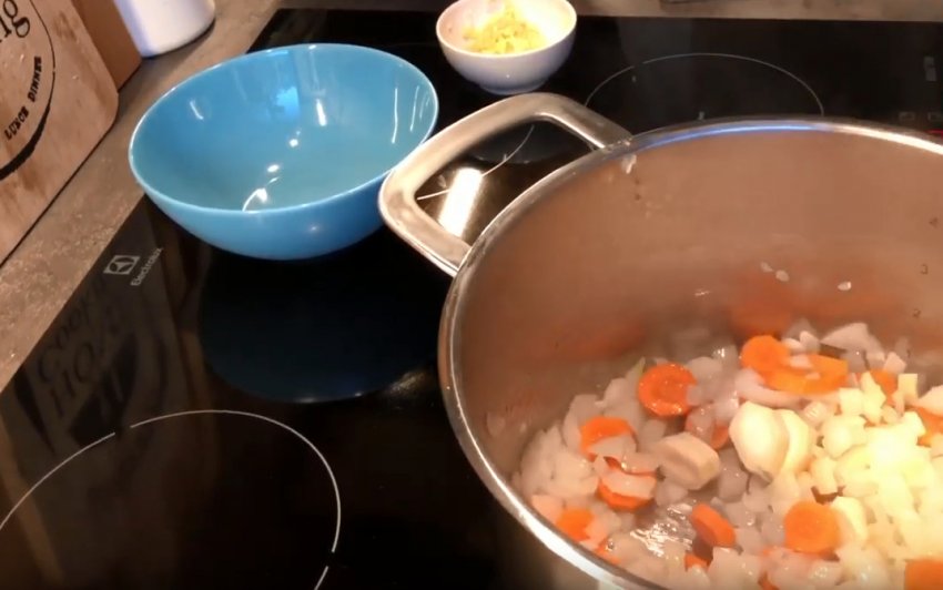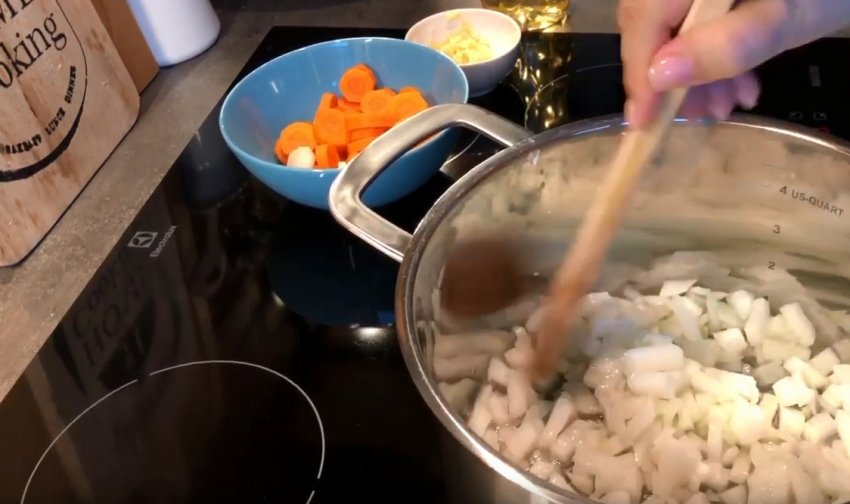 Морквину також подрібнити (або кубиками, або кільцями - кому як подобається). Її покласти в каструлю, коли цибуля стала м'якою. Добре буде поєднуватися петрушка разом з іншими інгредієнтами, тому в каструлю бажано додати подрібнений корінь петрушки.![]()