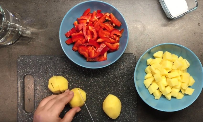 Цибулю порізати дрібною соломкою, картоплю нарізати брусками.![]()