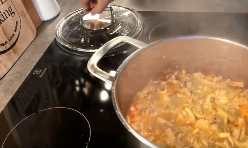 Наприкінці покласти часник і паприку, оскільки ці прянощі мають властивість підгорати, потрібно додати трохи води.![]()