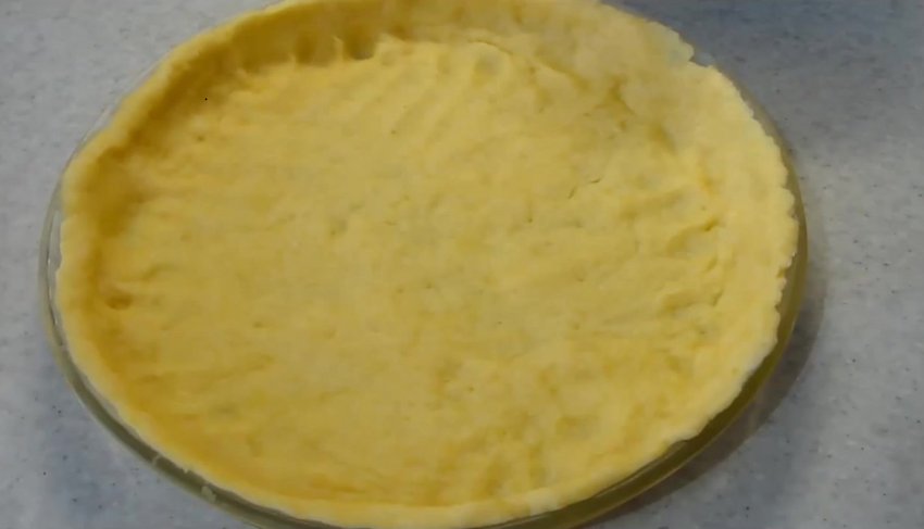 вийняти з холодильника і розділити на дві частини: одна для основи з бортами, розміром 2/3 від усієї маси, друга - верх пирога. Основу пирога розкачати і розмістити на деку, змащеному олією, напустивши краї на ребро дека.![]()