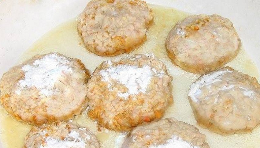 - Сформувати котлети невеликого розміру й вмочити їх з усіх боків у борошно.