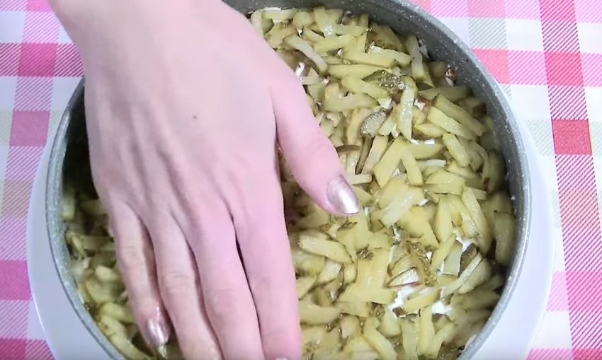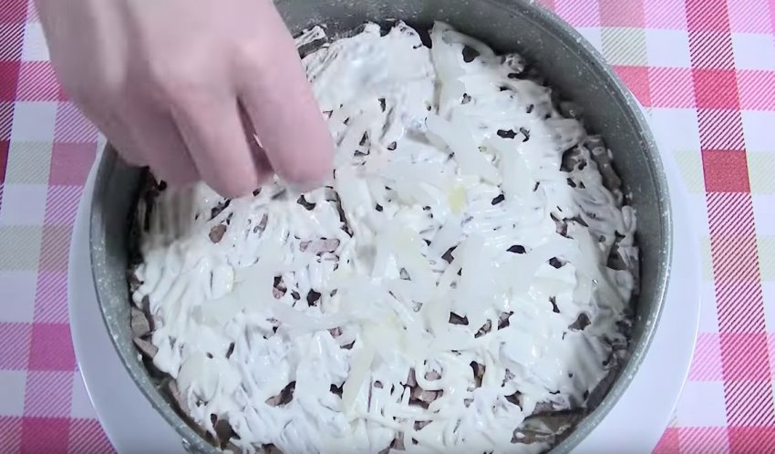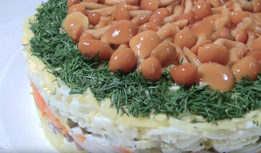 Описаний грибний салат можна зробити як "перевертиш", тобто укладати шари в глибоку ємність крок за кроком у зворотному порядку, починаючи від самого останнього, після чого перевернути ємність із вмістом на велику тарілку. У будь-якому разі, страва вийде дуже яскравою, тому що кожен із шарів матиме свій окремий колір.
