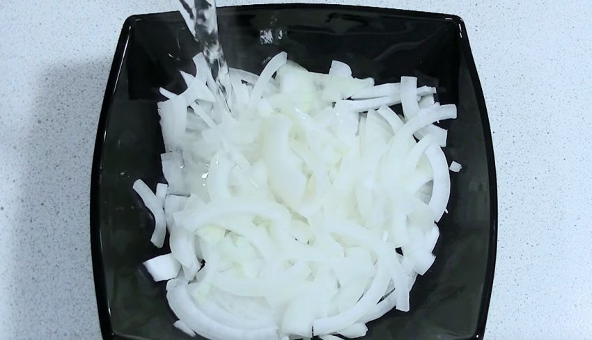 Ріпчасту цибулю нарізати соломкою і залити окропом на 10 хвилин.![]()