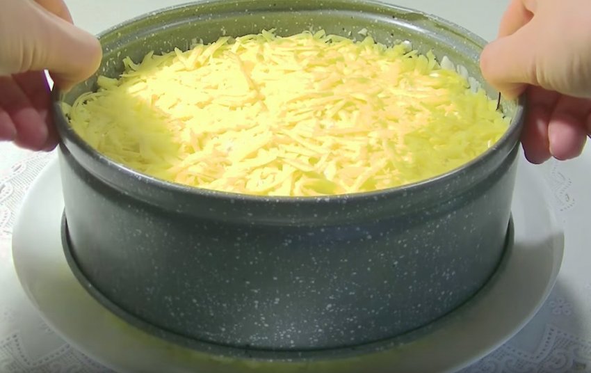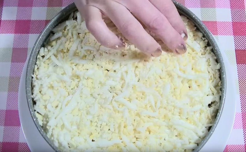 Потім яйця і тонкий шар майонезу. зверху натерти твердий сир.![]()