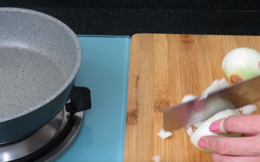 - Цибулину і часник порізати у вигляді маленьких кубиків.