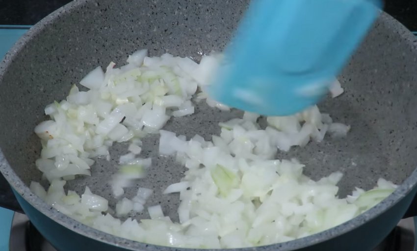Цибулеву сировину обсмажити до золотистого кольору. Додати подрібнений часник.![]()