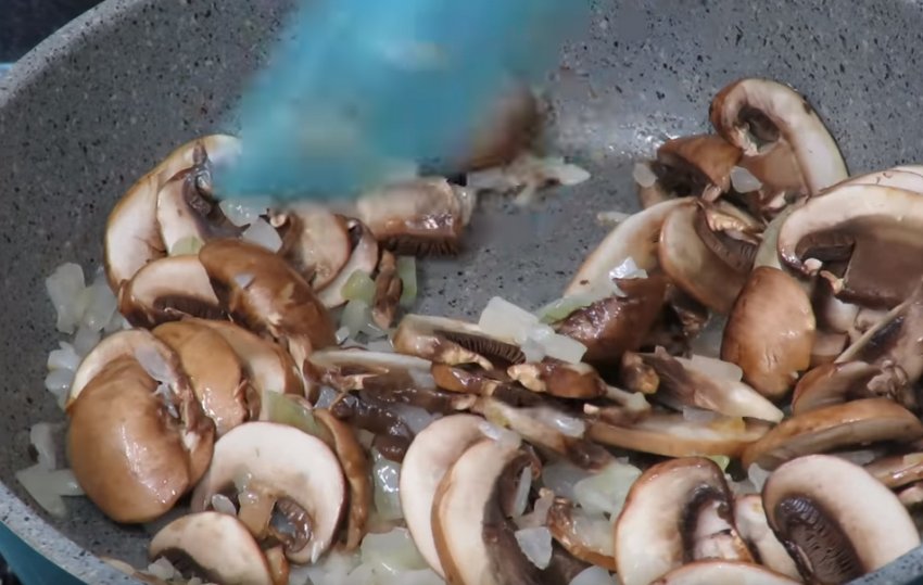 - До цибулевої суміші додати нарізані гриби. Готувати доти, доки зайва волога не випарується.