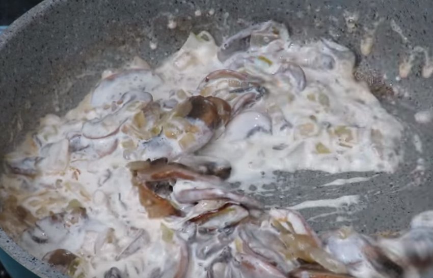 залити вершками, довести суміш до потрібного смаку за допомогою солі, перцю і мускатного горіха. Томити вершково-грибну масу протягом 2-3 хвилин.![]()