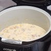 - Цибулево-грибну суміш залити вершками, приправити сіллю та перцем. Встановити мультиварку на програму "Тушкування".