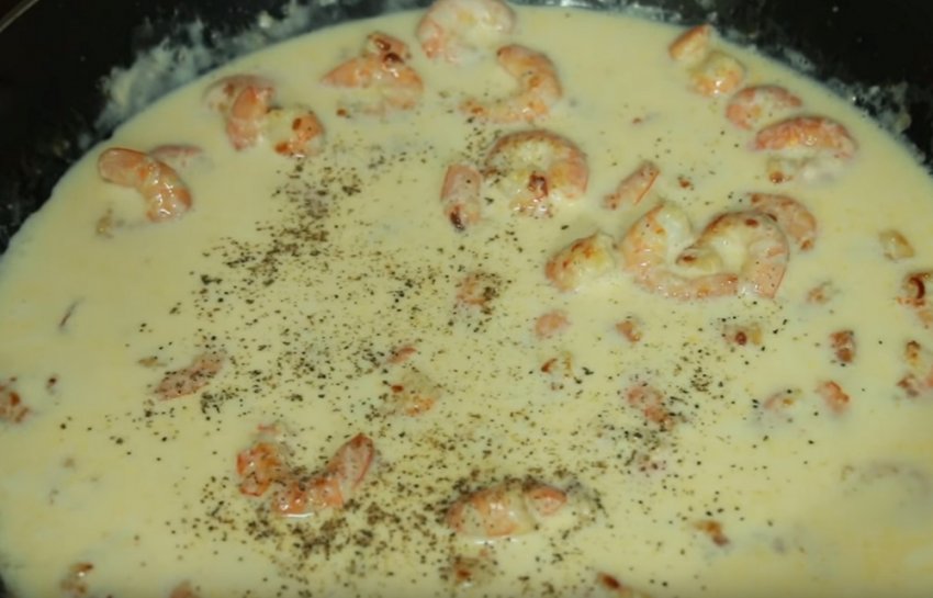 макарони. Креветки обсмажити на оливковій олії. Залити морепродукти вершками та молоком. Нашаткувати петрушку і відправити її в соус.![]()