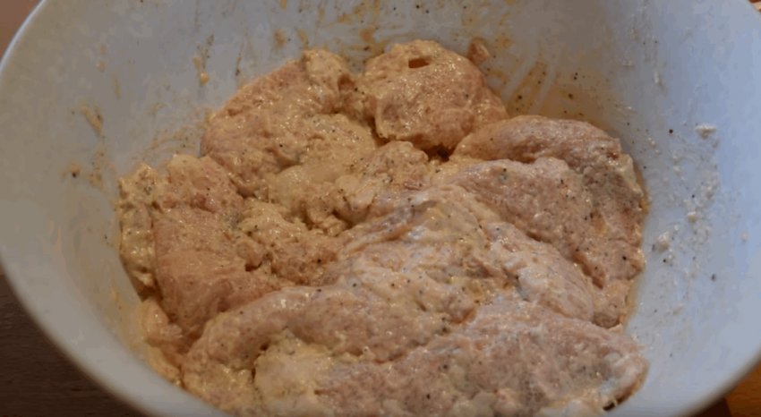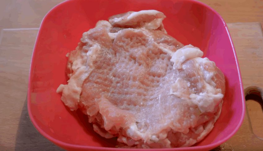 Викласти м'ясо в глибокий посуд. Приправити сіллю та перцем. Додати майонез і перемішати. Свинина має промаринуватися протягом 30-40 хвилин.![]()