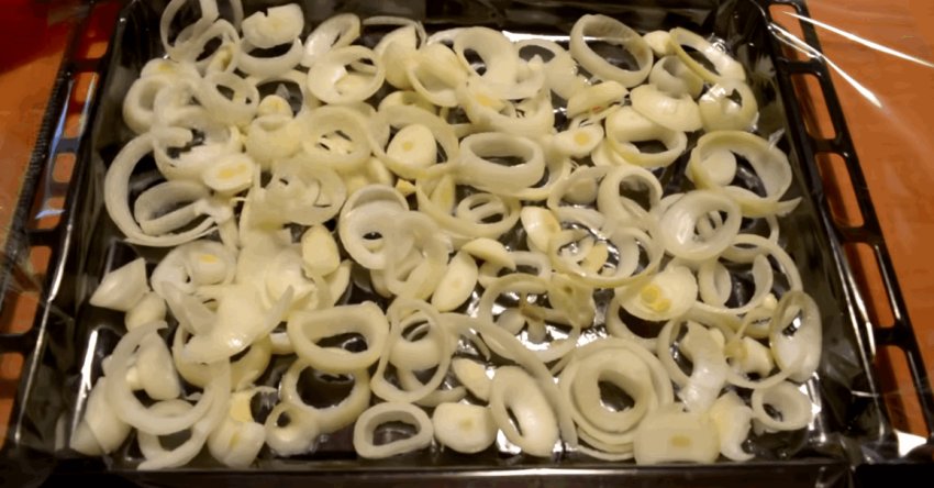 Деко застелити фольгою або рукавом для випічки. Змастити поверхню рослинною олією, і викласти цибулю.![]()
