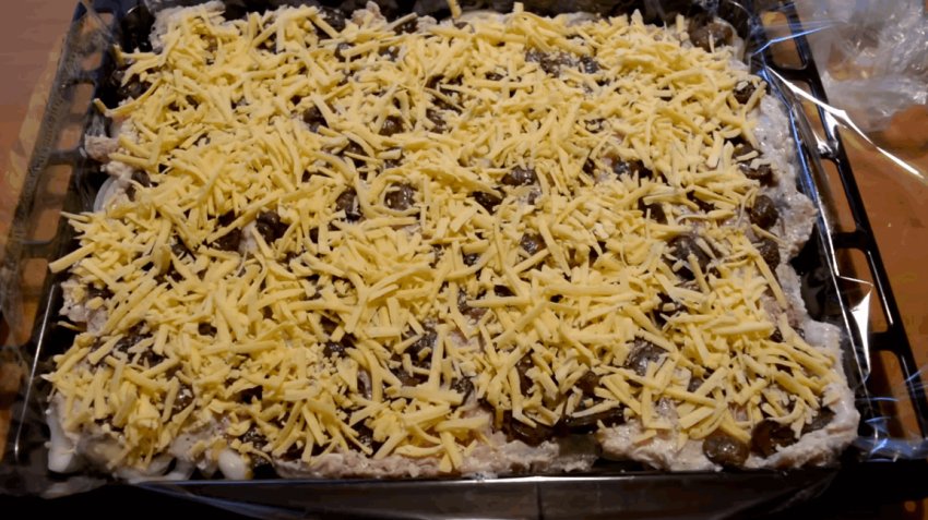 Поверх цибулі покласти мариновану свинину, потім гриби і зверху посипати сиром.![]()