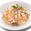 - Після того, як стече вода, покласти макаронні вироби на сковорідку, де знаходиться підсмажений бекон, додавши туди ж суміш із грибами.