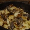 - Очищену картоплю нарізати шматочками невеликого розміру і додати її до обсмажених грибів.