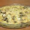 - До вищевказаної суміші додати картоплю. Посолити та поперчити інгредієнти. Під закритою кришкою випікати решту 25 хвилин.