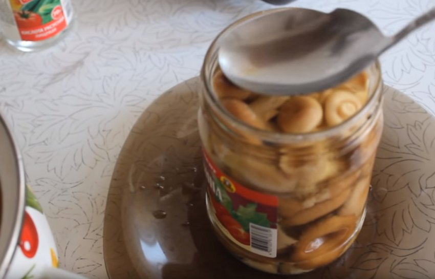 На дно розігрітої стерильної банки укласти зубчики часнику.Туди ж укласти гриби і залити маринадом.Додати 0,5 ч. л. оцтової кислоти.![]()