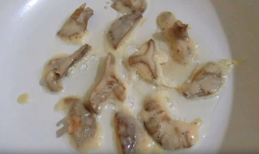 - Додати до смаженої цибулі вершкове масло, гриби, дрібно порізаний кмин і спеції.