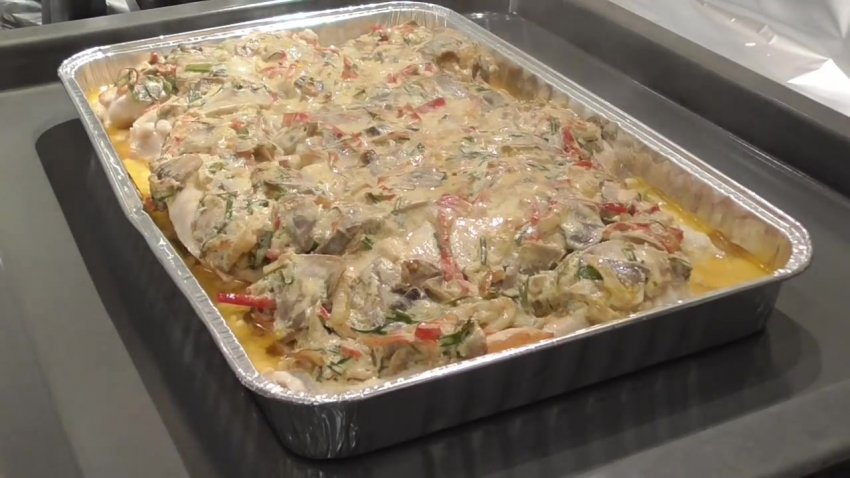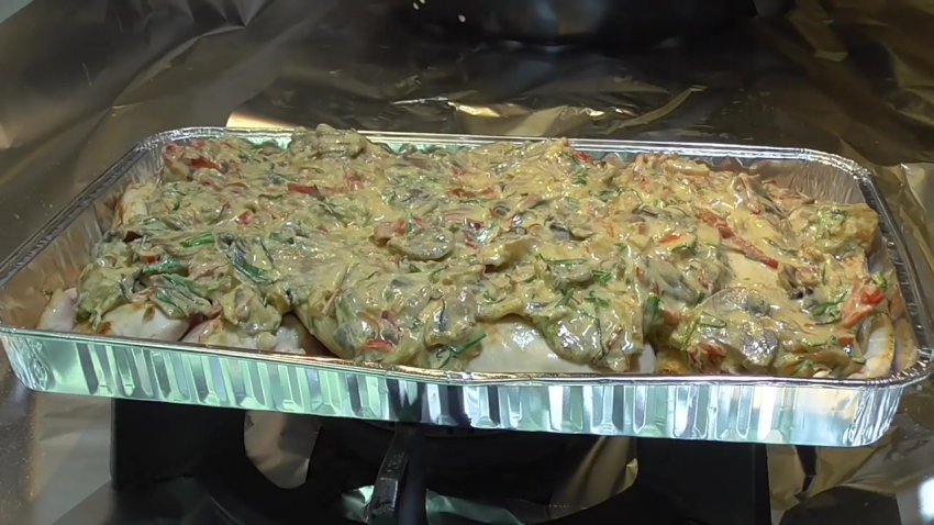 розігріти до 180°С. У глибоку форму для запікання викласти обсмажене куряче філе, залити вершковим соусом, накрити фольгою, помістити в духову шафу на 40 хв.![]()