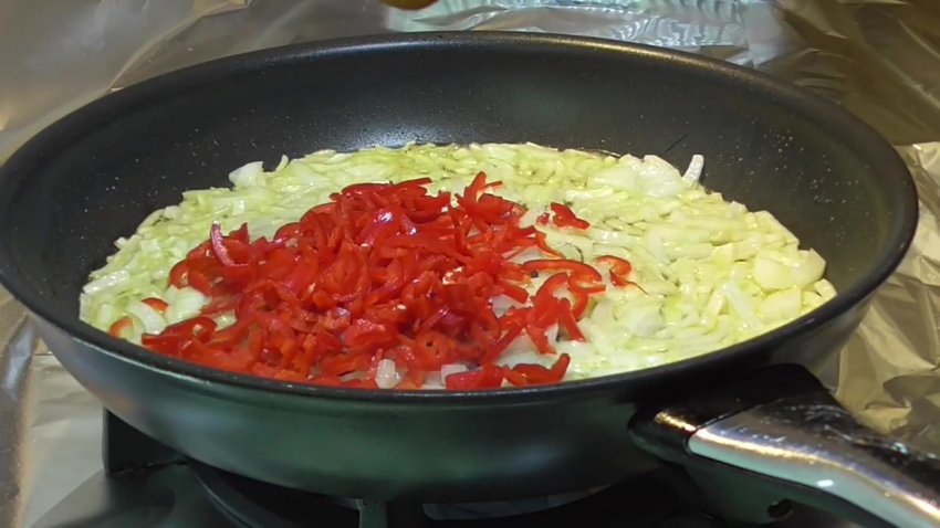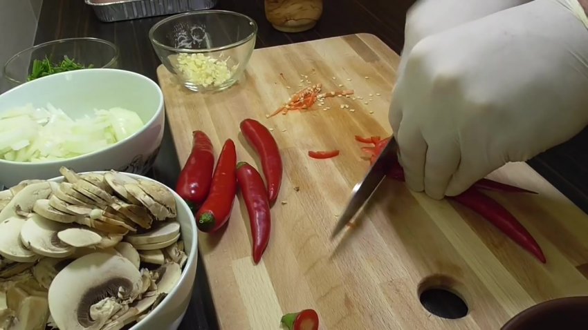 чилі очистити, нарізати тонкими кубиками, додати до цибулі, коли та стане прозорою.![]()