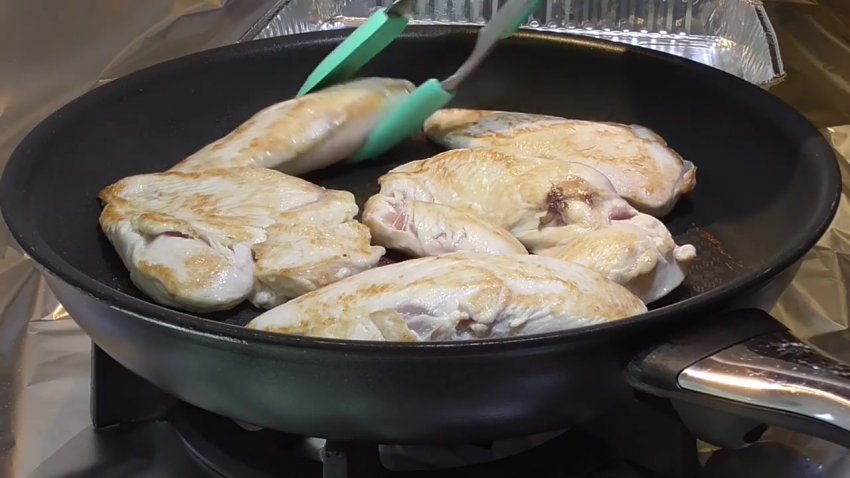 - Поставити на вогонь велику сковороду з 4 ложками олії, розігріти, покласти курку. Спочатку не накривати, потім готувати під кришкою.