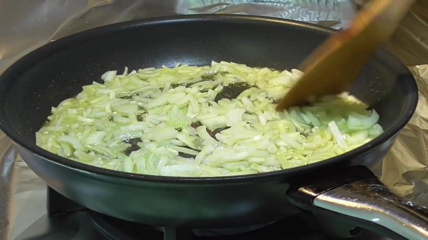 очистити від залишків філе, влити олію, що залишилася, розігріти на сильному вогні, пасерувати ріпчасту цибулю до прозорого стану, постійно помішуючи.![]()