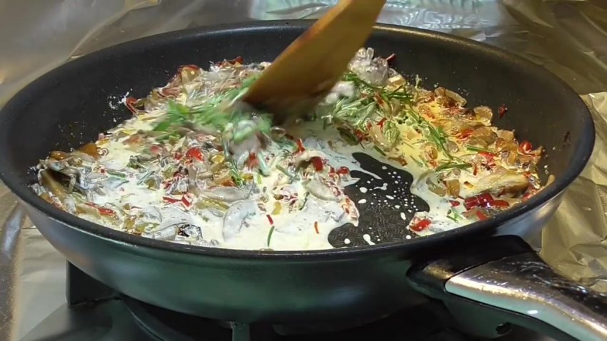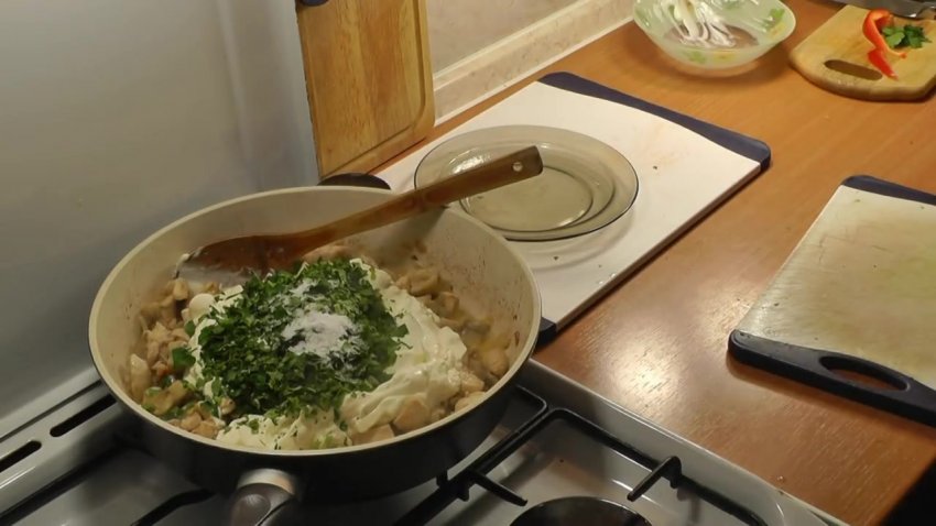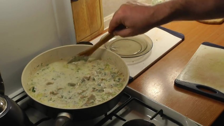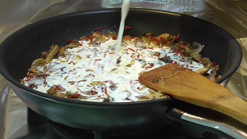 - Влити вершки, перемішати, накрити кришкою, витримати 10-15 хв.