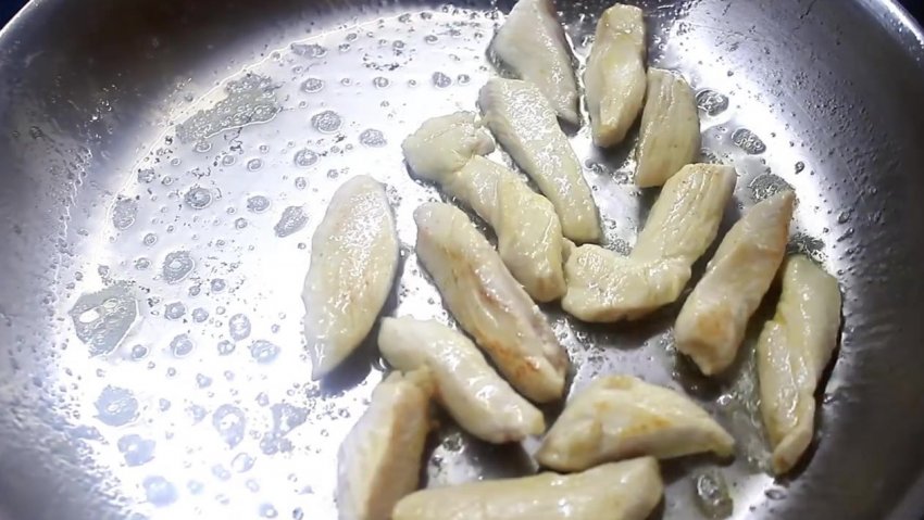 сковорідку з антипригарним покриттям злегка змастити олією, розжарити, на сильному вогні обсмажити шматки курки з кожного боку до золотистого кольору протягом 1-2 хв.![]()