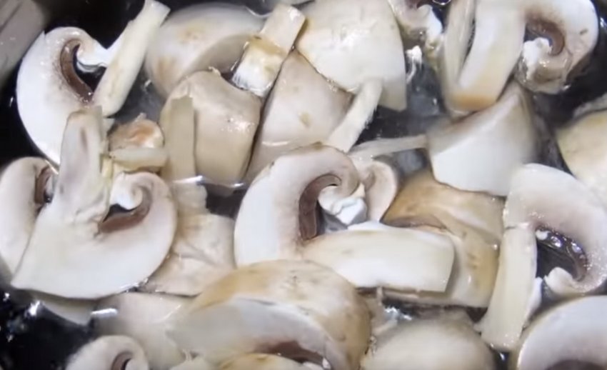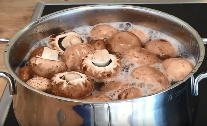 Вилийте в каструлю воду, злегка посоліть її і, довівши до кипіння, перекладіть у рідину підготовлені печериці. Залиште їх варитися під закритою кришкою протягом 15 хвилин.![]()