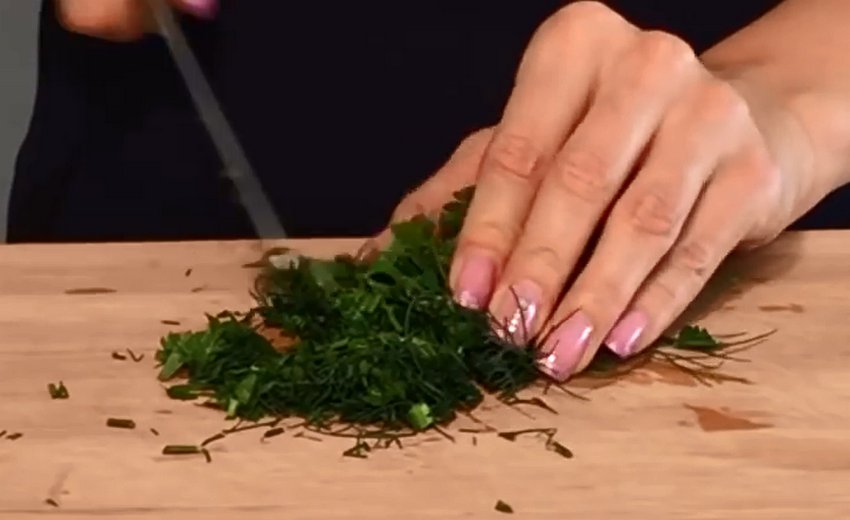 Помийте і обсушіть зелень, а потім дрібно наріжте кріп із петрушкою.![]()