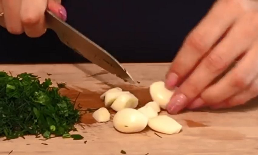 Почистіть часник, і кожен зубчик розріжте на кілька великих частин.![]()