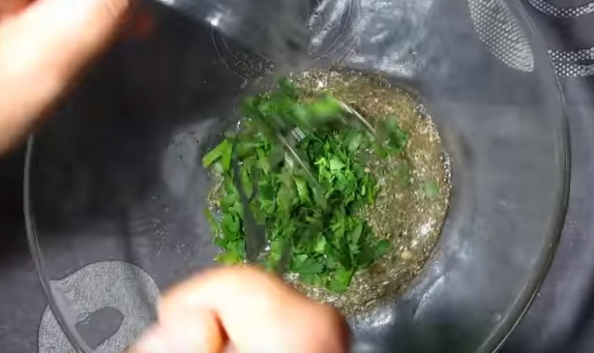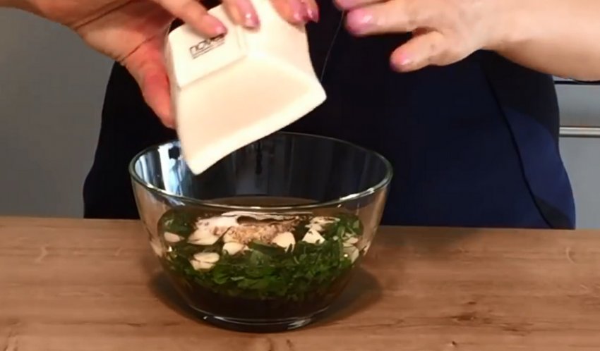 Змішайте часник із подрібненою петрушкою та кропом, влийте до них соняшникову олію, соєвий соус, оцет, висипте насіння кунжуту, решту спецій (зокрема лавровий лист) та посоліть суміш за своїм смаком, добре перемішуючи всі інгредієнти.![]()