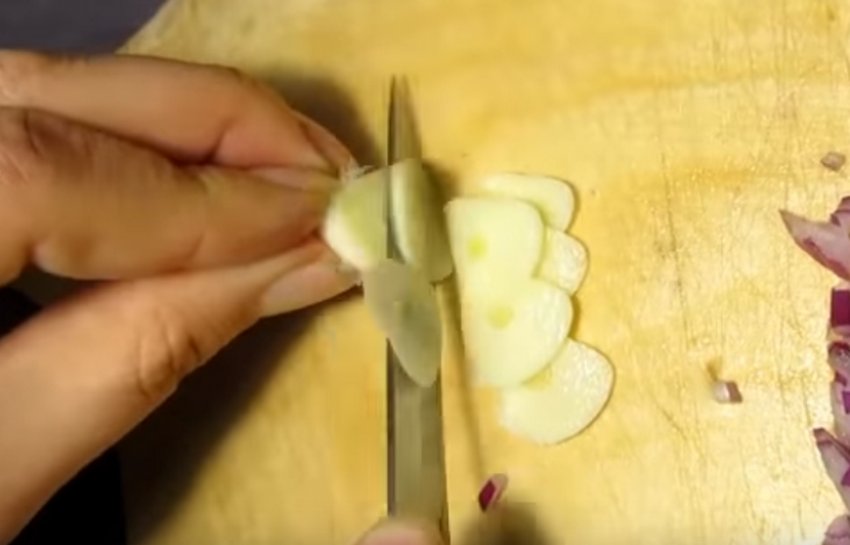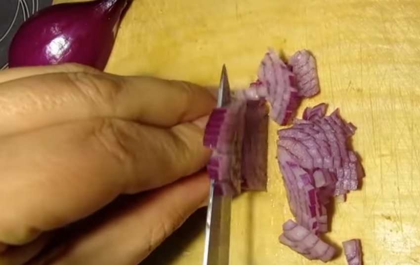 Поки варяться печериці, очистіть і дрібно наріжте цибулину (кубиками).![]()